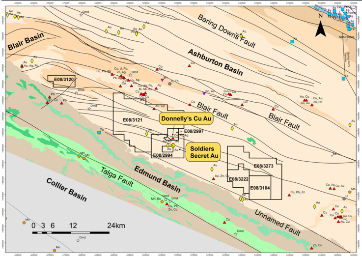 The project area is underlain by Proterozoic sedimentary rocks of the Ashburton Basin, a WNW to ESE trending basin of folded sediments that includes siltstone, sandstone, shale and carbonate units within the project area. Throughout the Ashburton Basin, abundant Gold and Base Metal occurrences, including the Mt Olympus Gold Deposits located ~100kms to the west, are spatially associated with major WNW to ESE-trending fault and fold structures. Several of these regional mineralisation-controlling fault structures traverse the project area, with multiple faults converging in the south of the project near the major lithospheric domain boundary with the Edmund Basin to the south.