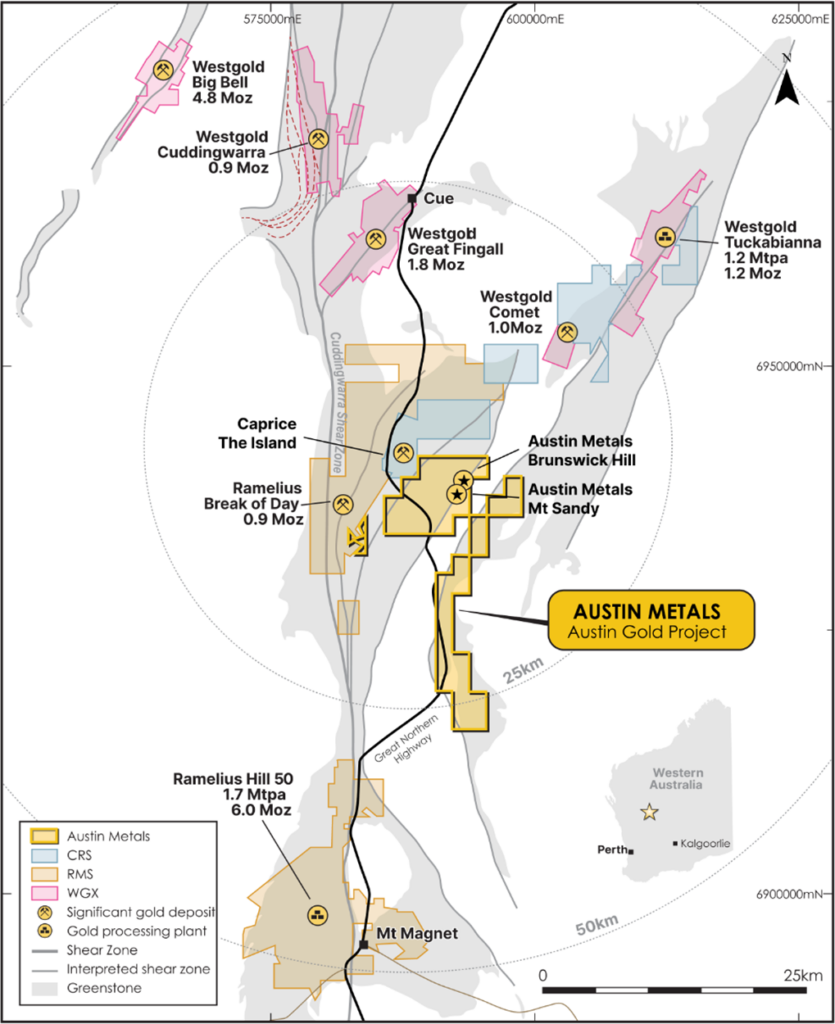 The Austin Gold Project covers approximately 175 square kilometres in the renowned Tuckabianna and Mt Magnet greenstone belts, positioned 45 km north of Mt Magnet in the heart of the prolific Murchison gold mining district. The Murchison Province has historically produced more than 17 million ounces of gold and continues to deliver significant resources and discoveries, with active exploration by companies such as Musgrave Minerals. The project enjoys excellent regional infrastructure, lying within 50 km of two operating mills owned by Ramelius Resources and Westgold Resources, and directly adjacent to the Great Northern Highway. This provides strategic optionality for potential future development.